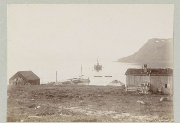 This albumen print, “Werf in Antibes”, was made by Delizy, using photographic processes to capture a shipyard scene. It's not a grand vista or a posed portrait, but a glimpse into the everyday, emphasizing the setting itself. Photography in this era was a labor-intensive process, demanding careful preparation of materials and meticulous execution in the darkroom. This specific print, with its sepia tones and soft focus, highlights the material qualities of the photographic process itself. The inherent limitations and characteristics of the materials are showcased in the artwork. The image offers insight into labor and class of the people in Antibes. It prompts us to consider the work that went into both the scene depicted, and the making of the photograph itself. By appreciating the craft involved, we deepen our understanding of the image, and question the traditional hierarchy between art and craft.