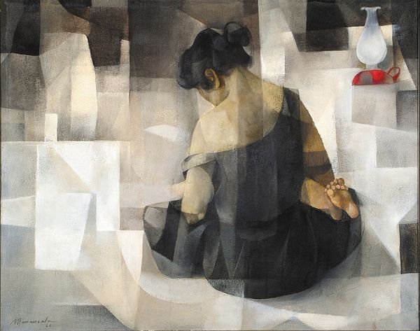 Curator: This is Oskar Schlemmer’s “Three Figures with Furniture-like Forms,” housed here at the Harvard Art Museums. Editor: It’s austere. The figures are so geometrically reduced. Almost…oppressive. Curator: Schlemmer’s work often explores the relationship between the human figure and architectural space, influenced by his time at the Bauhaus. Editor: Right, the attempt to streamline, standardize…almost dehumanize. Is that what's so unsettling? The lack of individuality? Curator: Perhaps. Or perhaps the painting reflects a broader interrogation of identity in the face of rapid industrial and social changes, the individual subsumed within larger systems. Editor: Maybe Schlemmer is inviting us to question the very nature of progress and its impact on human connection. Curator: Indeed, a poignant, and lasting, artistic statement.