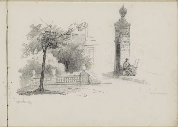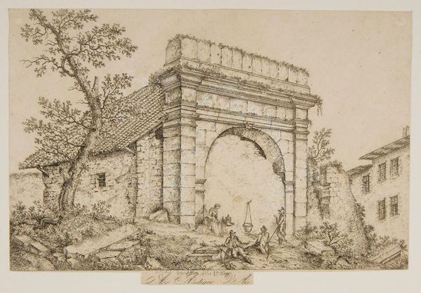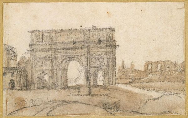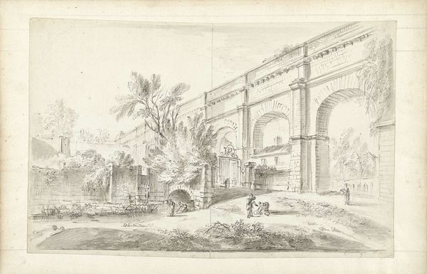 Curator: This is Thomas Girtin's "An Indian Building," housed at the Tate. The support measures 133 by 200 mm. Editor: It feels like a memory fading—ephemeral, almost lost. The composition is so light, airy, with only the barest details defining this structure. Curator: Precisely. The linear quality emphasizes geometric forms against the negative space, enacting a play between presence and absence. Editor: But there's a human element too, softened by the technique. Those figures hint at lives lived within and around this architecture. Curator: Indeed. The architectural rendering serves as a signifier of cultural exchange, mediated through Girtin's distinct artistic lens. The contrast between the building's rigid structure and the fluid lines of the figures creates a dynamic tension. Editor: Yes, I can see that. I'm left pondering what Girtin hoped to express about the cross-cultural experience with this piece.