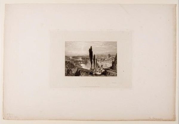 Editor: This is Charles Herbert's "Santa Maria del Fiore, Florence". It's a delicate line drawing. The intricate details make me wonder about the artist’s intention to capture the essence of the architecture. What compositional elements stand out to you? Curator: The linear precision and delicate hatching create a compelling interplay of light and shadow, emphasizing the structure. The spatial arrangement, with the cathedral anchoring the composition, leads the eye through carefully constructed planes. What do you make of the horizon line in relation to the architectural subject? Editor: It gives a sense of place, almost as if the building is part of the landscape. I noticed the foreground vegetation adds depth. Thanks! Curator: The composition reinforces the architectural forms. Understanding the visual rhetoric helps appreciate the artist's deliberate choices.