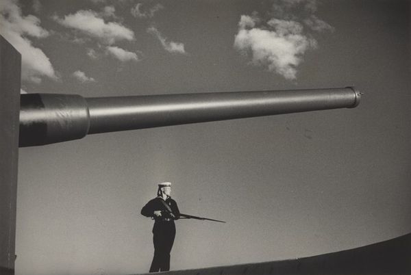 Curator: Today, we’re looking at Imre Kinszki's photograph, “Untitled (Elizabeth Bridge and Bridge Chain)," taken in 1929. It captures a detail of the Elizabeth Bridge in Budapest, rendered in a stark, industrial aesthetic. Editor: The imposing geometries immediately strike me. These immense, truncated metal beams reaching skyward exude an almost brutalist monumentality. It feels as though we are dwarfed by progress itself. Curator: Absolutely. Kinszki’s framing emphasizes the formal elements: the strong diagonals of the bridge chains, the cylindrical and cubic forms of the joining elements, all set against an almost blank sky. It’s a powerful study in geometric abstraction found within a functional structure. Note the almost clinical precision in the silvery grey tones, reinforcing a sense of detachment. Editor: I see a cultural echo, a visual shorthand for strength and connection. Bridges are potent symbols of transition, passages between states of being. Elizabeth Bridge, in particular, carries a history; it was destroyed during World War II and rebuilt later. Kinszki's image unwittingly becomes a memento of something vulnerable despite its imposing stature. Curator: A fitting observation. The composition invites us to consider structure as both physical reality and symbolic language. How the forms interact – their angles, their relationships to the picture plane – contribute to the photograph's overall impact. The texture itself provides important information; is it metal? Stone? It feels simultaneously permanent and temporal. Editor: I appreciate that ambiguity. We’re drawn to both the bridge’s enduring symbolism and the ephemeral moment Kinszki captured. The eye is lured in by that geometry, but lingers considering a broader scope: perhaps the losses suffered during wars and the rebuilding efforts which shape identities. Curator: Kinszki gives us a structured vocabulary that pushes us towards modernity's evolving aesthetic language. This allows our view to extend past utility toward abstract and semiotic significance. Editor: Indeed. Ultimately, I feel it reminds us that even within the cold language of industrial design, potent symbols live on.