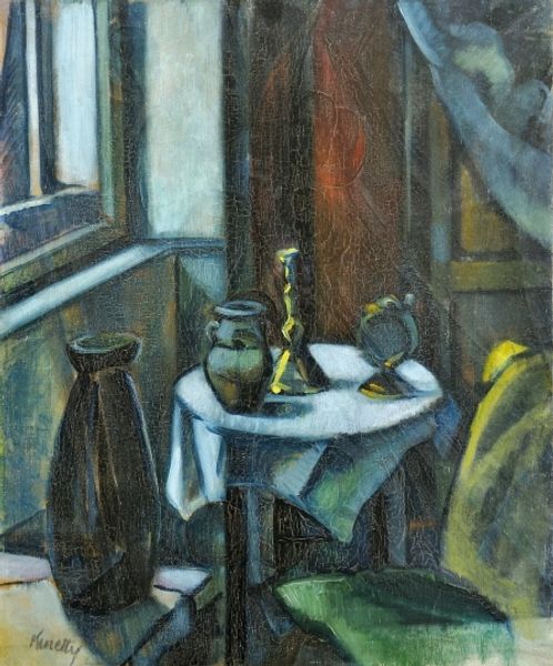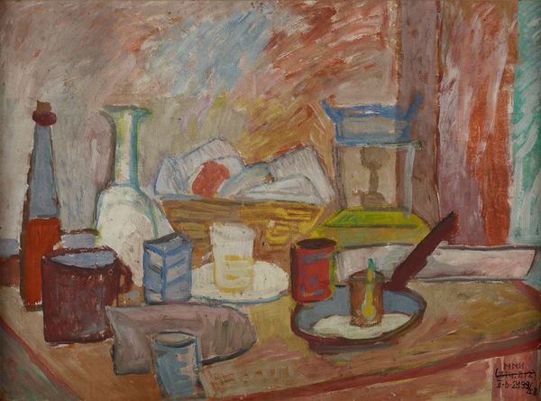 Editor: Here we have Pinchus Kremegne’s "Still Life with Basket, Jug and Fruits" from 1948. The heavy impasto and slightly muddied colors give it a really earthy, grounded feel. What’s your take on it? Curator: It's interesting to consider this through the lens of postwar scarcity. The thick application of oil paint—the impasto you mentioned—almost transforms everyday objects into precious, tangible assets. Consider the raw materials involved: linseed oil, pigments... Even the canvas itself represents resources. Does this materiality heighten our awareness of post-war realities? Editor: That's a compelling idea! So you're suggesting the painting isn't just *depicting* scarcity, but almost embodies it through the very physicality of its materials? Curator: Exactly. And look at the basket. Woven objects, humble craft traditions – Kremegne elevates these utilitarian items to the realm of fine art. How does that challenge the hierarchy of art versus craft, do you think? What sort of social and economic labor goes into creating these goods? Editor: It blurs the lines, doesn’t it? Makes you think about who gets to define “art” and what kind of labor and social capital counts towards it. It feels almost democratic, in a way. Curator: Precisely. By highlighting the material reality and inherent labor of even the simplest still life components, Kremegne prompts us to reassess value and question what is deemed worthy of aesthetic contemplation. Editor: I never thought about it like that, but seeing the raw materials themselves as part of the statement changes everything. Curator: Absolutely. Looking at art through this lens of production and materiality can really open up new avenues for interpretation.