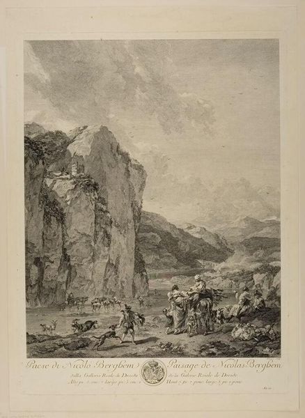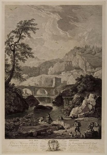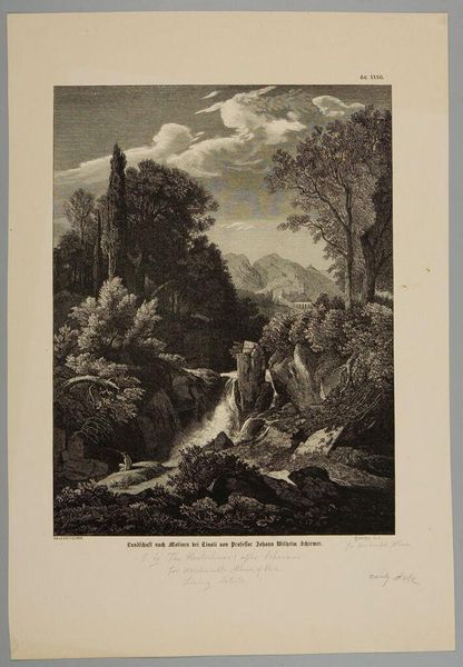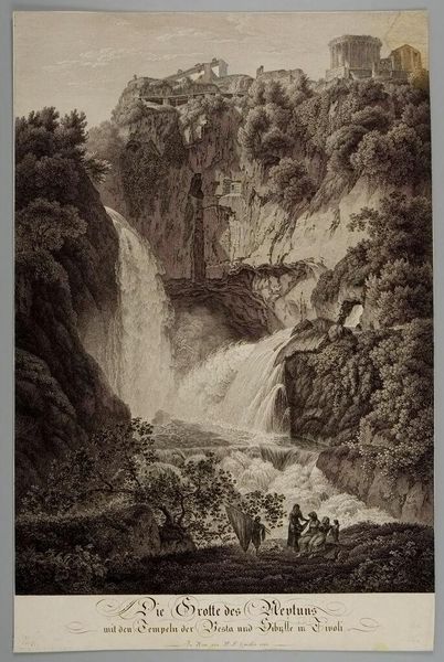 Curator: This is Albert Christoph Dies' "Cascatella di Tivoli." Editor: It feels like a romanticized vision, a bit idyllic. Look at the lone figure in the foreground, contemplating the sublime power of nature. Curator: The waterfall itself, and the cascading water below, carry connotations of renewal, the constant cycle of life and transformation. Water has always been deeply symbolic. Editor: And the way the artist positions that tiny person against the immensity of the landscape underscores themes of human insignificance and our fragile relationship with nature. Is it about power, or fragility? Curator: Perhaps both co-exist. The image certainly evokes a sense of awe, but also vulnerability. It's a contemplation on the human condition in relation to the natural world. Editor: It makes me wonder about Dies’ own relationship to nature. Was he documenting beauty or questioning our place within it? Curator: Ultimately, "Cascatella di Tivoli" invites us to reflect on these age-old questions, prompting a dialogue between the individual and the vastness of the world.