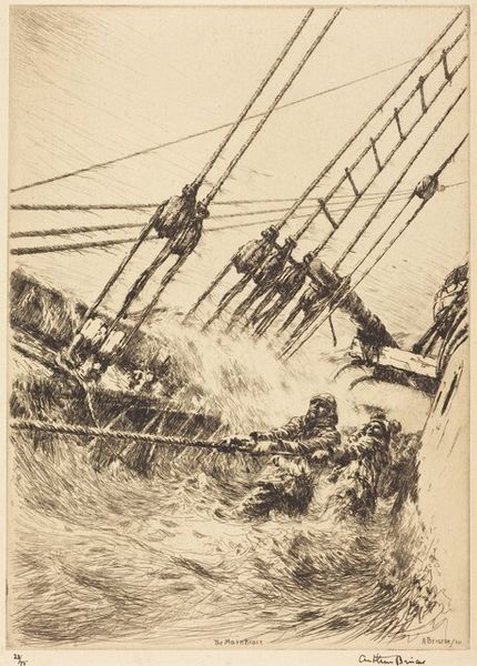 Curator: Immediately I’m struck by how turbulent the scene is; it's almost claustrophobic with all that water bearing down on these figures. Editor: What we’re looking at is an etching titled “All Hands” by Arthur Briscoe, dating back to 1926. It exemplifies Briscoe's skillful rendering of maritime life, a recurring subject throughout his oeuvre. His personal experience sailing undoubtedly influenced the subject and material. Curator: I see the figures are almost obscured, subsumed by the wave itself, a powerful metaphor for the working class battling against forces beyond their control. Their representation calls into question issues of labor, class, and the individual versus societal power structures. Editor: Indeed. Etching as a process is interesting here. Notice the density of line—it’s crucial to evoking the conditions the workers endure. The labor involved in both sailing and the etching process reflect one another in the density of manual labor, don't you think? It emphasizes the conditions in which art, and these lives, are produced. Curator: The artist deliberately chose this medium. The density of those lines definitely contributes to the overarching feeling of struggle. Is this image a social commentary about worker's rights, or merely a reflection of the circumstances? Is he positioning the work as documentary? Editor: I feel like we can’t overlook Briscoe’s intimate engagement with boats themselves. The production of these boats in 1926 must have involved considerable social structures. In the face of the move to industrial production, his etchings capture the final stages of manual boat-making; and therefore, become a kind of social document. Curator: Seeing those fine lines, so delicately wrought, reminds me of the perilous and demanding lives these workers lead. As an activist I seek to bring their realities into broader social consciousness and challenge these inherent inequities in representation. The narrative this print creates really makes you consider their social situation within the maritime environment of the 20th century. Editor: Briscoe's “All Hands" reminds us how closely the processes of making are connected. In both art and labour there's a tension to endure and transform material into something beyond itself. Curator: Ultimately, the struggle illustrated in the print asks how art can function to address conditions of power—perhaps it starts with representing those very people!