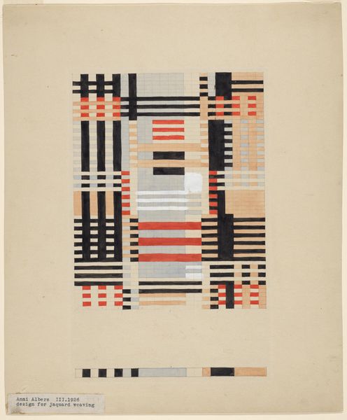 Editor: Here we have Anni Albers' "Design for a Rug," a vibrant piece. The grid-like pattern immediately grabs your attention, with its mix of textures and colours. What do you see in how Albers has organized these elements? Curator: The work presents a compelling study in contrasts. Observe how Albers juxtaposes geometric precision with the subtle irregularity of the hand-drawn lines. The interplay of color and texture creates a dynamic surface, wouldn't you agree? Editor: Definitely, the texture feels so tactile, even on paper. It’s interesting how the geometric shapes are softened by the hand-drawn elements. What impact does this tension create? Curator: It invites a deeper engagement with the formal elements. The structural grid is disrupted by organic variations, questioning the very nature of order and design. A successful strategy, wouldn't you say? Editor: I see what you mean; it adds complexity and nuance to an otherwise simple design. Thanks, that gives me a new perspective. Curator: Indeed. Paying close attention to form can open new paths of inquiry.