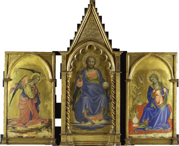 Editor: This is "Madonna Triptych," made with tempera, by Álvaro Pires de Évora, in 1456. The gold leaf and the arrangement feel very precious and intentional. What do you notice in terms of its historical relevance? Curator: It's fascinating to consider this triptych within its social and religious context. Triptychs like these were not just devotional objects but also potent symbols of status and power. How do you think the prominent display of wealth, through materials like gold, would have affected its reception in the 15th century? Editor: Well, it seems like it would reinforce the power of the church, or whoever commissioned it. Was that typical of art at this time? Curator: Absolutely. During this period, art served specific functions within society. Commissioning such an elaborate piece was a public declaration of piety and wealth. Notice how the central panel depicts the Virgin and Child surrounded by saints; it’s a very deliberate staging of heavenly court, wouldn’t you say? Editor: I do. It seems very formal, almost like a family portrait, but elevated to a divine status. I hadn't thought of art quite like this, as a socio-political tool! Curator: Precisely. Understanding the power dynamics embedded within a work like this can drastically alter how we perceive it. What do you make of the smaller panels? The narratives they present contribute to a larger religious framework and underscore the patrons' desired public image. Editor: I see the angel on one side and a sorrowful woman on the other. Together with the central image, they tell a whole story, like visual propaganda almost! This was very enlightening. Thank you. Curator: My pleasure. Reflecting on how art served these varied purposes allows for a more complete understanding of not just the object, but also of the culture that created it.