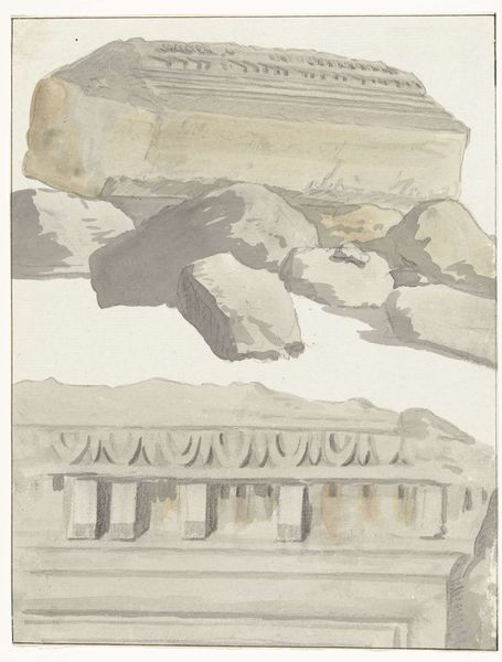 Bartholomeus Ziesenis drafted this monument design for C. Brunings, featuring a column base on a plinth. The column, a visual symbol of strength and stability, has origins in ancient cultures, particularly in Greek and Roman architecture. It symbolizes not only architectural support but also power and commemoration. It represents a connection between the earthly and the divine, a concept that recurs throughout history. Think of Trajan's Column in Rome, for example, where the column serves as a narrative of military triumph, or the pillars in ancient Egyptian temples, each carrying hieroglyphs that tell stories of pharaohs and gods. The memory of these grand structures can affect our subconscious, instilling a sense of permanence. In Ziesenis’ design, the column base suggests a foundation, a steadfast structure upon which to build memory. In this design, the visual weight of the plinth supports the column, conveying a sense of somber respect. Just as symbols evolve over time, so do our emotions and interpretations.