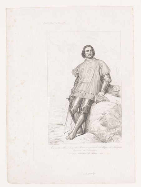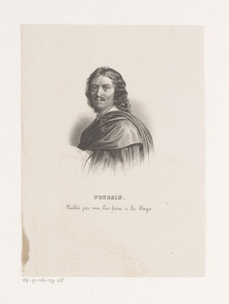 Curator: Let's turn our attention now to an engraving from 1847 by Joseph Schubert. This piece, housed here at the Rijksmuseum, is entitled "Portret van Nicolas Poussin." Editor: Even in grayscale, I am immediately drawn to the subject’s composed demeanor; there is something very calm in the rendering of his face. Curator: Schubert's expert handling of line is evident here. Notice how the engraving technique mimics the textural richness one might find in a painted portrait. The artist utilized delicate, hatched lines to construct the form and subtle tonalities. Observe also how the balance achieved by Schubert emphasizes an almost ideal rendering. Editor: Beyond the expert rendering, Nicolas Poussin, one of the greatest exponents of classicism in French painting, is also cloaked in potent visual signifiers: his garb suggests refinement and scholarly status. That soft cape slung over his shoulder becomes symbolic of erudition and distinction, a celebration of intellect itself. Curator: And that very intentional gesture aligns well with his art and the philosophy and classical structures evident in it. Indeed, the structure within this very portrait, particularly in the triangular stability suggested by the bust’s geometry, complements Poussin’s artistic philosophy. Editor: Absolutely. It's as though Schubert understood how to encapsulate the essence of his subject— not just a likeness but a statement about identity, tradition, and accomplishment. Curator: In essence, Schubert not only creates an engaging visual form, but also pays respect to a very accomplished painter and artistic figure of the 17th century through his focus on geometric simplicity. Editor: For me, this portrait does more than capture Poussin's likeness; it transmits something deeper, an echo of cultural memory and significance, through recognizable symbols. Curator: Well, with that being said, it gives us a unique way to look at how meaning in pictorial language, in particular, can have enduring forms. Editor: Agreed; one could definitely consider this work for a long while, as the meaning here could go quite deep indeed.