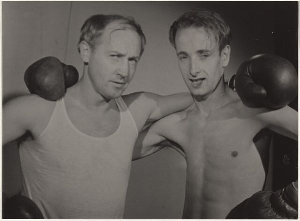 Curator: This is Harold Edgerton's "Man Punching Bag," currently housed here at the Harvard Art Museums. Editor: The monochrome gives it such a timeless, almost haunting feel, doesn't it? Like a scene from a forgotten era of smoky gyms. Curator: Indeed. Edgerton’s pioneering use of stroboscopic flash allows us to dissect the mechanics of the punch with unprecedented clarity. The light reveals form and motion, a study of kinetics. Editor: It's more than just mechanics, though. Look at the focused intensity on the boxer's face, the flexing muscles. It’s a portrait of human determination, distilled to its essence. Curator: A fair point. The composition leads the eye from the rigid form of the bag to the determined gaze of the athlete, a duality of object and will. Editor: Ultimately, it's a stark, beautiful image that lingers in the mind long after you've moved on. Curator: I concur. Edgerton has created a work that transcends the boundaries of sport and science.