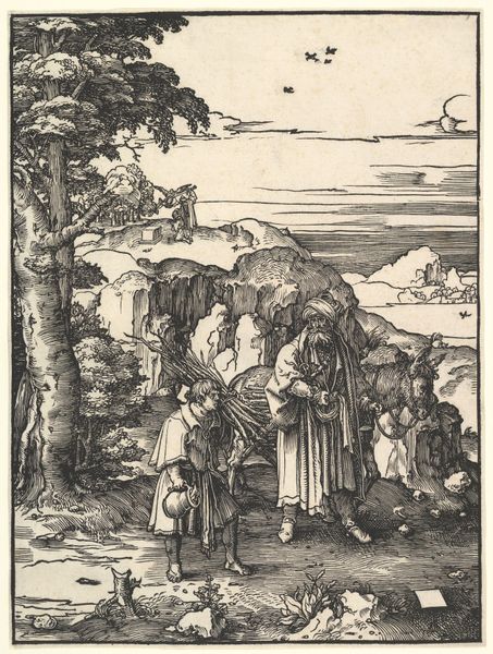 Curator: Here we have a woodcut print by Hans Burgkmair, dating from 1517 to 1526, titled "Theuerdarnk Nearly Shoots Himself with a Crossbow," part of a larger illustrated book about the adventures of the knight Theuerdank. Editor: It feels… tense! I mean, visually. So much detail crammed in, that almost frenetic energy of the lines – it’s like a moment right before everything explodes, a horse rearing, an arrow flying. Curator: Absolutely, the busyness reflects the period. Courtly love narratives were huge. Think of the labor involved; each line meticulously carved, a whole workshop dedicated to producing these images for wider distribution. And consider the economics – illustrated books meant literacy was spreading, new markets opening up. Editor: True, but looking at the crossbow bolt whizzing upwards… It's a comical moment of near-disaster frozen in time. Did wealthy folks laugh at stories where they nearly got shot? It feels a little… self-aware. Curator: Maybe! The court probably loved the spectacle. But remember, Burgkmair didn't just spontaneously create this image; it's a product of patronage. Emperor Maximilian I commissioned this whole elaborate allegory, the *Theuerdank* poem, which was then turned into a printed book designed to boost his dynastic prestige. These books are full of subtle propaganda if you care to notice. Editor: So, craftsmanship as a PR exercise? The ultimate humblebrag. Ironic. You look closer and all the tiny, almost obsessively detailed foliage becomes about power, about status... Funny how our feelings can shift once we look a little closer. Curator: Precisely! The material is never just material. In its time it reflected very intentional goals related to its distribution. And it is an aesthetic artifact that provides some insight to what came after it. Editor: Alright, time to go buy myself some stationary. Time to plot some crossbow accident. And by crossbow accident I mean like… ordering Thai. Food that involves bow and arrow. Curator: Maybe, time to focus again on the arrow and its relation to distribution channels within publishing networks… I'm not going to ask.