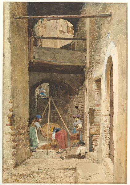 Curator: This watercolor painting, "A Moonlit Street in North Africa," is credited to Eugène Girardet, a French artist known for his Orientalist scenes. Editor: Ah, instantly calming. The soft blues and muted oranges give it this feeling of being wrapped in a quiet secret. What draws me in most is the subdued light—it's almost tangible. Curator: Girardet excelled at capturing the subtleties of light and shadow. Looking at the painting with an activist's lens, it brings to mind the power dynamics inherent in Orientalist art, this desire to portray and often exoticize non-Western cultures. Editor: Yes, there's that familiar tension, isn't there? On one hand, I appreciate the sheer artistry of depicting a specific time and place; the textures of the stone and fabric seem so delicately rendered in watercolor. But, stepping back, I wonder about whose story is truly being told. Do we hear the voices of the figures nestled in that street corner, or just Girardet's interpretation of them? Curator: That tension is exactly what makes studying these works so rich, and complex. Girardet's perspective, undeniably filtered through his own cultural lens, offers insight into the way 19th-century Europeans viewed North Africa. But that very viewpoint simultaneously obscures and reveals aspects of the depicted lives. Editor: You know, thinking about it further, I am struck by the absence of any grand statement. There is just the hum of ordinary life. And perhaps that's the magic—or maybe the deception—that holds the painting together. The invitation into a silent, contemplative moment. Curator: Yes, maybe the painting is asking us less to "see" North Africa, and more to simply be still within it, and interrogate what that act of observing actually means. It forces us to be mindful of our role in the very act of seeing, of interpreting someone else’s existence. Editor: A reminder, then, that our interpretation is a brushstroke too. Perhaps one should not be hasty in settling to facile judgement, particularly with pieces from eras seeped with ideological complexities. Curator: Right—it encourages ongoing conversation rather than conclusions. Thank you, that was enriching.