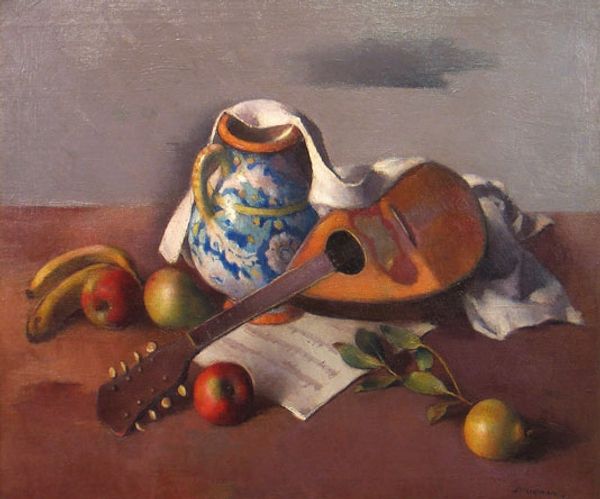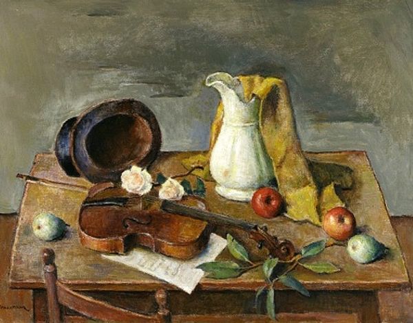 Andre Derain made this oil painting, titled "Still Life", sometime in the 20th century. The restrained earth-tone palette, with subdued oranges, creams, and whites, suggests a process of slow observation, a kind of meditative seeing that draws you into the quiet of the studio. I love the way the paint seems to be applied wet-on-wet, creating a soft blurring around the edges of things like the fruit and the folds of the white cloth. It gives everything a gentle, hazy quality. Look at that white cloth—the way Derain builds up the forms with layers of white and grey. You can almost feel the weight and texture of the fabric. The cherries seem to have a life of their own, scattered on the plate with a carefree attitude. Derain reminds me of Cezanne, who also wanted to convey the solidity and weight of objects. But where Cezanne is all about structure, Derain brings a painterly looseness, a willingness to let the brushstrokes do their own thing. It's like a conversation between order and chaos, control and surrender, that I always find compelling.