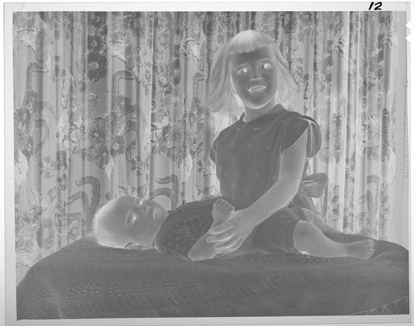 Editor: This is C. Bennette Moore's "Untitled (portrait of little girl on stool)." It's a small, silver gelatin print. It's an inverted image, which gives a really ghostly feel. What can you tell me about it? Curator: The negative presentation is intriguing. It removes the familiar and forces us to see the child differently. Photography in the early 20th century was becoming more accessible, shifting portraiture from elite painting to a more democratic medium. How does the stool elevate the child, both literally and figuratively? Editor: I guess the stool makes her seem more important, like a little queen. Curator: Precisely. Photography, even in these intimate portraits, participates in constructing social narratives. It gives visibility, but also defines how we see and remember. Editor: I hadn't thought about the power dynamic in something so seemingly simple. Curator: Right. It’s a reminder that even personal images are embedded in the larger social and political landscape of visual representation.