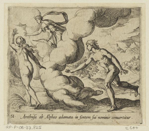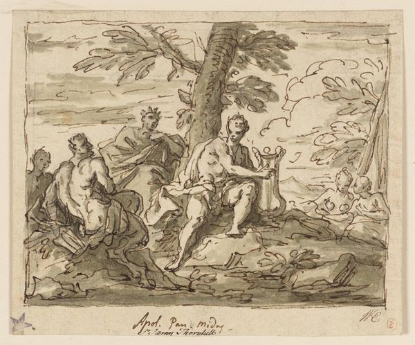 Editor: We’re looking at "Galatea and Acis with Polyphemus who is about to kill Acis out of Jealousy," a drawing whose artist and date are unknown, here at the Art Institute of Chicago. I’m struck by how this moment of impending violence is rendered with such delicate lines; the figures almost float. What do you see in this piece? Curator: Ah, it's like catching a glimpse into a half-remembered dream, isn't it? Those fluid lines – they don't just describe a scene; they convey a feeling. It’s the raw emotion, the drama of the myth unfolding. The jealousy feels almost palpable despite the classical composure. Do you notice how Polyphemus is poised? It's rage and sorrow swirling together, a beautiful kind of tragic poetry if I might be so bold to say so. Editor: The “half-remembered dream” quality is definitely present. What do you make of the lack of specificity in details? Is the emotional depth a function of this abstractedness? Curator: Precisely. The drawing is more focused on evoking feelings than illustrating a specific historical event, even though the mythological inspiration anchors the work. You can tell by the movement suggested with ink and chalk that it's aiming to make you *feel* the legend, not simply observe it. Don’t you feel almost complicit in their romantic hideaway? Editor: I think I do. This really casts new light on how I perceive even incomplete or anonymous artwork as carrying tremendous depth. Thanks for sharing your thoughts! Curator: And thank *you* for joining me on that plunge, perhaps an equally jealous plunge! Now to look for my own nymph to guide...