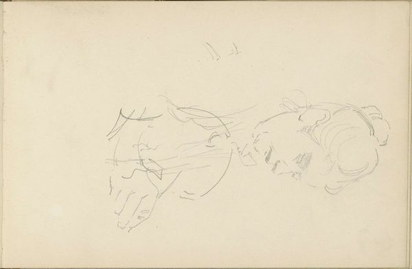 Editor: This graphite drawing, "Two Male Heads, in Profile," was sketched by George Hendrik Breitner sometime between 1881 and 1883 and is currently held in the Rijksmuseum. The immediate impression is that of fleeting observation, of capturing a momentary likeness rather than striving for precision. What jumps out at you when you look at this, our Curator? Curator: You know, it feels as if Breitner has spied on these two fellas. He’s like a visual eavesdropper, swiftly sketching their essence before they vanish like a daydream. See how the lines are so sketchy, so raw? There’s no attempt to smooth things over, to pretty them up. Instead, we get this unfiltered glimpse, almost as if we’re leafing through his private sketchbook. Don’t you feel like a trespasser, in a way, looking at something so immediate and intimate? Editor: I do a bit! The looseness of the line almost makes it feel like a memory. Do you think it might be influenced by the Impressionistic movement? Curator: Absolutely. It has that quintessentially Impressionistic flavor, right? He isn’t trying to give us all the answers, is he? Instead, he hands us these suggestive fragments, trusting us to fill in the blanks with our own imaginations. Who were these men? What were they talking about? Where were they going? The beauty, for me anyway, lies in those very questions. They swirl in my mind like coffee mixing with cream. Editor: It really leaves the narrative open. I love that. I didn't expect to find such narrative possibility in a simple sketch of heads. Curator: Right? Sketches, the underbelly of art! It’s like peeking into the artist's mind, witnessing their first flutters of inspiration, unburdened by the weight of expectation. These seemingly casual scribbles have so much to tell us.