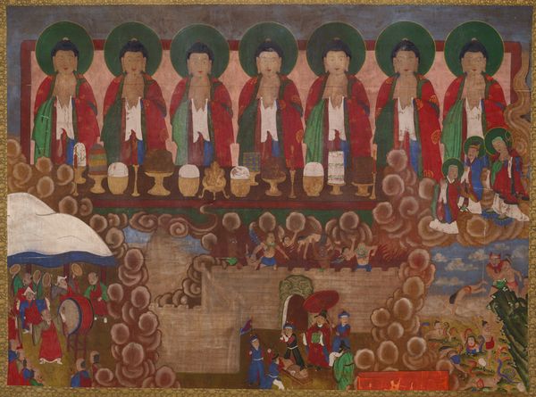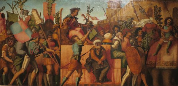 Curator: Immediately striking, isn’t it? This Italian Renaissance panel painting radiates an almost dreamlike quality, a processional scene rendered in soft colors with touches of shimmering gold leaf. Editor: The dreamlike quality, I think, comes from its inherent contradictions. This celebratory image, purportedly titled "Triumph of Chastity" by Lo Scheggia seems laden with performative symbolism and an odd, almost sterile energy, wouldn't you agree? What social and historical forces do you feel are at play here? Curator: Well, Lo Scheggia, a painter working in Florence, was deeply embedded in the cultural and intellectual currents of his time. Think about the socio-political position of women, which depended in significant ways on her alleged chastity and moral restraint. That period experienced enormous growth in how it expressed that societal structure. Consider how such allegorical works acted within the sphere of power at the time and served the needs of powerful elites? Editor: It’s impossible to ignore the ways in which the idea of “chastity” was used to control and confine women, of course, the visual narrative further complicates matters. There's the figure, perhaps Chastity herself, atop a triumphal car pulled by what looks like… lions? While around the chariot, an assortment of figures—likely representing virtues—dance and celebrate. How do you see this tableau serving the gendered and intersectional politics of its time? Curator: We could read those lions as symbols of tamed passion, right? Conquered by the virtuous woman, by chastity. And the act of celebrating Chastity publicly certainly underscores its perceived societal importance at the time, emphasizing that women were required to be modest at all times. Editor: Agreed. But it also reinforces an art history narrative dominated by, in many ways, power dynamics. We often glorify works created for elite, influential circles without considering their broader social effects and if there is anything genuinely 'liberating' in them at all. Do you see any modern-day correlations? Curator: Today, the ways women's bodies are still scrutinized and legislated are just reflections of that history. Looking at art like this gives us an opportunity to confront these ongoing societal challenges directly, in new ways. Editor: Precisely. It allows us to engage in a continuous dialogue about image-making and power. A complex topic for our listeners. Curator: But a vitally important one.