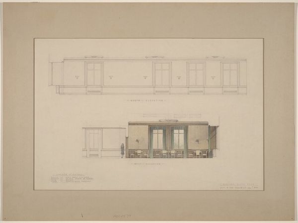 Curator: This drawing, simply titled "Italian Fourteenth and Fifteenth Centuries: Gallery 1," was sketched by Eggers and Higgins, Architects, in 1939. It's rendered in pencil and etching on paper. The image depicts an elevation and end view of a gallery space. What catches your eye? Editor: Immediately, I sense this strange blend of precision and almost unsettling emptiness. The architectural details are so crisp, yet the lack of activity, save for a lone figure, suggests a contemplative space, perhaps a longing for history to fill it. It feels very self-consciously composed, and a little haunted, I guess. Curator: The figure you noticed is particularly key. Architects often include human figures in their drawings to give a sense of scale. But you're right; it’s more than just practical. I think he serves as a stand-in for the viewer, beckoning us into this carefully planned space. Editor: Yes, and I find the repetition interesting. The three gothic window frames on the left and the stark rectangles of the wall opposite create a visual rhythm. Are these echoes of particular shapes in the art displayed within? It feels significant. Curator: Definitely! These window frames recall the Gothic period that dominated the 14th and 15th centuries in Italy, a motif repeated. So they not only indicate architectural features but also the types of artworks expected within. The window shape speaks for the cultural epoch being presented here, almost like a herald. Editor: A portal, quite literally, and symbolically. That doorway too feels so weighty in its classical simplicity, doesn't it? As if guarding access not just to physical space but to historical memory. This is so compelling. Even if, yes, haunted by a profound emptiness. Curator: I like that – historical memory. Indeed, I agree. Perhaps this drawing isn't just about designing a space, but creating a vessel for art and the ideas it carries across time. Editor: Exactly. It almost feels less like architecture, more like stage design for art’s drama. A really lovely thing, on balance. Curator: Yes, it makes you reconsider not only the era depicted, but the museum design itself, as well. A moment to contemplate its dual purpose as display space and repository.