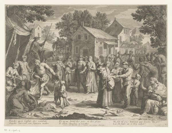 Editor: This is "Dorpsfeest," or "Village Festival," an engraving made in 1748 by Jacques Philippe Le Bas. The level of detail is incredible! It feels almost photographic in its rendering of daily life. How would you interpret this work? Curator: The power of this print lies precisely in its structural organization and the careful modulation of tone. Observe how Le Bas employs a sophisticated system of cross-hatching to delineate form and texture. The distribution of light and shadow is particularly effective in creating a sense of depth and visual interest. Do you notice how the foreground is rendered with greater detail than the background, thereby drawing the viewer's eye into the composition? Editor: I do see that now! The figures in the front really pop, and everything else sort of recedes. What about the architecture? It’s very prominent in the piece. Curator: Indeed. The architecture functions as a structuring element, dividing the pictorial space and creating a rhythm of forms. Note how the diagonal lines of the roofs intersect with the verticality of the trees, producing a dynamic interplay of spatial relationships. Also, how does the texture contrast in surfaces—the roughness of thatch and smooth surfaces of faces and clothes impact the image as a whole? Editor: That’s fascinating; I hadn’t considered that the architecture does play such a major structural role in directing my sightlines and helping emphasize contrasts in form. Curator: Exactly! Le Bas orchestrates a complex visual language in "Dorpsfeest", and one comes away with a deeper appreciation of visual strategies. Editor: Thanks, I see the picture in a whole new light, not just the scene depicted, but also the printmaking style in itself.