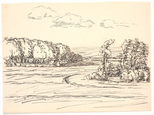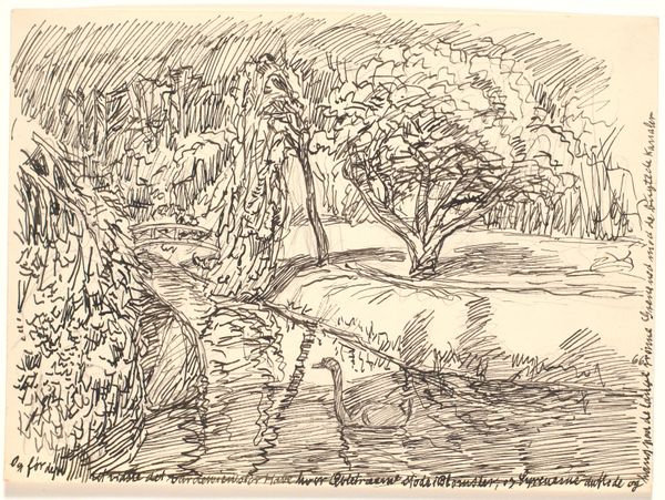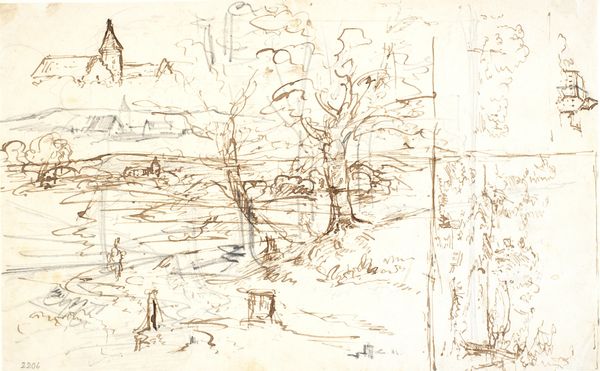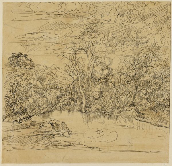 Curator: Before us, we have Rodolphe Bresdin's "Advance Guard," a drawing rendered in ink on paper. Its date remains unknown, adding to its mystique. Editor: The scene seems so restless, almost agitated. There's a nervous energy to the lines. They scratch across the paper, creating a landscape that feels both fantastical and precarious. Curator: Bresdin, a Romantic printmaker, frequently explored themes of isolation and the individual spirit navigating a complex world. Looking at his landscapes, teeming with detail, it feels as if we are decoding the visual lexicon of a forgotten dream. Editor: Those tiny figures gathered in the foreground. Are they soldiers? Pilgrims? Refugees? They appear dwarfed by the landscape, barely clinging to the edge of it all, huddled together perhaps for protection. Curator: Given the title, they’re likely an advance scouting party. The symbolic resonance of this gathering cannot be ignored. Bresdin’s personal struggles surely manifest in these renderings of vulnerable figures dwarfed by imposing settings. Note the detail – see how he suggests forms with hatching and swirling lines? Editor: The rocks in the foreground, the fortress-like structures further back… they remind me of memory palaces, constructed out of fragments, folklore, and the subconscious mind, these symbolic stones, all seem to hold stories. It seems like such a desolate existence, so small against those monolithic landscapes, these people seem to seek hope even under looming despair. Curator: He struggled financially, exhibited at the first ever Impressionist exhibition, and he influenced many Symbolist artists including Redon, whose use of black resonates Bresdin’s artistic legacy. What this leaves us with is something intensely, strangely romantic. He almost paints his world’s turmoil into a sense of eerie yet, somehow, peaceful belonging. Editor: Yes, even with the tension in the lines, there's a strange harmony. The eye travels throughout the piece seeking something which almost cannot be defined. Maybe that's part of his unique genius. Curator: A testament to seeing beyond the surface of things. To truly appreciate the visual symbols laid here takes one beyond art itself, allowing new pathways into philosophy, humanity, and psychology. Editor: Indeed. Leaving you pondering, with only your own symbolic landscape to unpack it.