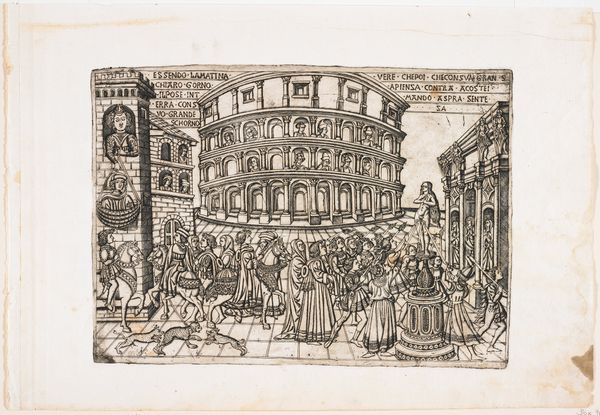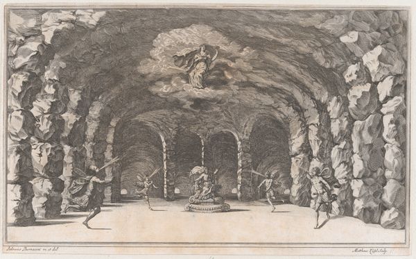 Curator: What strikes me most is the ephemeral nature captured in this etching, "A group of young men dancing as the gods look on from above; set design from 'Il Pomo D'Oro'" by Matthäus Küsel, dating back to 1668. The scene depicts a performance, now lost to time. Editor: It's undeniably Baroque, but with a theatrical air! I am thinking about the conditions surrounding operatic performances in the 17th century. There's a tension between the divine and the mundane in the work's architecture that immediately attracts my attention. Curator: As an etching, it's a readily reproducible medium, which in itself speaks to a broadening accessibility of art. It lets us examine the social context of its creation and dissemination, who had access to art, to these lavish theatrical productions, and in what form. It's also a durable, almost mass-produced form compared to a singular stage. Editor: Exactly. It hints at the social hierarchies within these spectacles, too. Look at how the elite—the gods, elevated above, watching. Their presence serves as a potent reminder of authority and divine right, deeply ingrained within Baroque society and how such societal structure shapes visual imagery. Curator: The line work itself, creating such detail and scale in print, reveals a fascinating level of craft and planning, the labor embedded in the multiplication of these images. Even the paper stock, the inks—all point towards production and consumption. Editor: Yes, these etchings functioned as visual propaganda of wealth and power, circulated to solidify status. Consider how these performances reflected the political landscape of the era; these aren't just drawings, they are socio-political documents! How stagecraft served the rulers, I am sure, would be its own subject here, showing that art served to solidify societal structure at that point in time. Curator: Absolutely, and it invites us to think critically about what remnants we retain today. It's a record of lost artistic practice but one now accessed through a print housed right here at the Met. Editor: It leaves me pondering the politics of image making in this period. We only see its presence through the distribution of material now carefully secured in institutions. Thank you for unveiling it for me with your critical analysis.