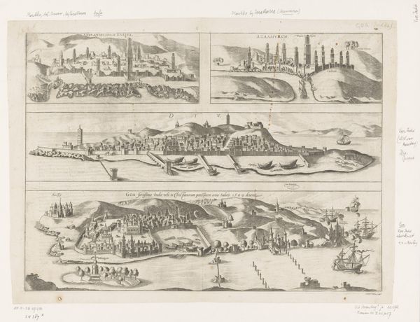 Curator: Let's discuss "The Conquest of Makassar," a 1676 engraving by Coenraet Decker, currently held in the Rijksmuseum collection. My first impression is one of almost overwhelming detail. The density of information is really something. Editor: Yes, quite busy. A dense layering of detail and tone certainly characterises the engraving. How do you see Decker manipulating that intricacy? Curator: He utilizes a remarkably fine line to create a palpable sense of depth, dividing the composition into distinct layers. From the foreground filled with imposing ships, the eye journeys back to the distant cityscape nestled beneath a dormant volcano. It’s quite a feat of spatial organisation, wouldn't you say? Editor: Undeniably skilled, but it also served a precise function. Consider the historical context: the Dutch East India Company sought to project its power, depicting military successes in distant lands to bolster their image and attract investment back home. It’s not just an image of conquest but a carefully crafted advertisement for colonial might. Curator: A valid point. The work undoubtedly celebrates Dutch colonial expansion, yet on a formal level, observe how the dramatic play of light and shadow adds to the visual dynamism. Decker contrasts the ordered, meticulously rendered ships with the more chaotic depiction of the burning cityscape. Editor: That visual tension mirrors the real conflict, albeit filtered through a Eurocentric lens. While we analyze the composition and artistic technique, it’s vital to remember the immense human cost of this ‘conquest’ for the people of Makassar. These depictions of power had devastating real-world consequences. Curator: Precisely, and to consider the artistic strategies used to perpetuate particular narratives, we see how the objective image it tries to convey falls apart with a contemporary view point. A layered artwork both textually and visually. Editor: A perfect illustration of how historical context reshapes our aesthetic experience, wouldn't you agree?
