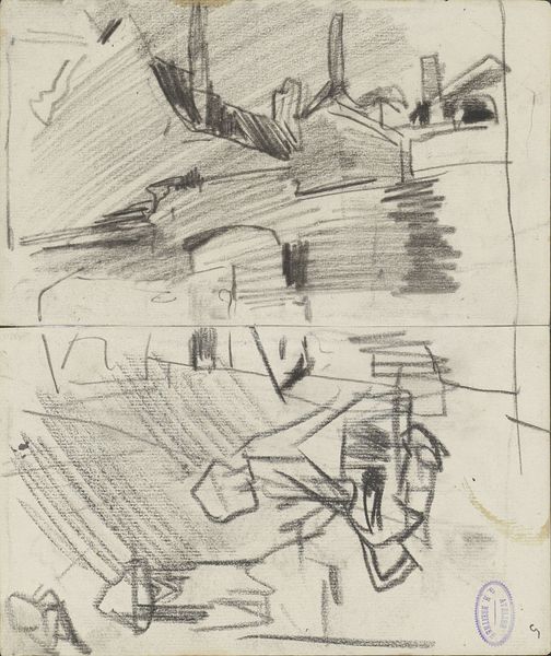 Curator: Before us is a work by Adrianus Eversen titled "Drie stadsgezichten," or "Three Cityscapes," rendered in pencil on paper, likely sometime between 1828 and 1897. Editor: There's an immediacy about these sketches, a quiet record. You get a sense of architectural shapes and suggested forms. The bareness speaks volumes; it's not a finished work but conveys a great deal of space. Curator: Eversen specialized in meticulously portraying Dutch city life during the 19th century. But it looks as though in these three pencil sketches, we see a rare glimpse into Eversen's process rather than the polished product for public consumption. This wasn't made for exhibition, of course; it likely comes from a sketchbook. I am curious to know if these streetscapes reflect a Netherlands wrestling with rapid urban and industrial transformation during that era. Editor: Definitely, there's the recognizable ghost of tradition mixed in with what was then "modernity," particularly visible through what look like public spaces like plazas. Those spaces may serve as icons of collective memory. Even the linear strokes imply structures that serve symbolic functions that go beyond the merely architectural. They hint at how cultural symbols become intertwined with city spaces to preserve meaning over long expanses of time. Curator: His finished paintings usually present bustling street scenes with market life, trade, and sometimes public works. I would hypothesize this shows that the visual strategies and even ideologies he used within public exhibitionary paintings were always preceded by smaller studies that capture how architecture shapes communal memory in Eversen’s imagination. This gives us an insight into the relationship between art making and memory construction at the popular level during his time. Editor: Looking again, the rapid lines almost evoke a dream-like impression, where specific architectural aspects begin to melt and blend. It underscores how deeply our perceptions of "place" are truly fluid and embedded within our interior psychological experiences. Curator: It seems in this raw, unfiltered state, these "Three Cityscapes" unveil Eversen's working processes as he interprets society. It's a great opportunity to analyze the relationship between art and memory at the societal level. Editor: I leave seeing beyond what I usually regard as objective physical matter within cities into an understanding of architectural presence and psychic landscape.
