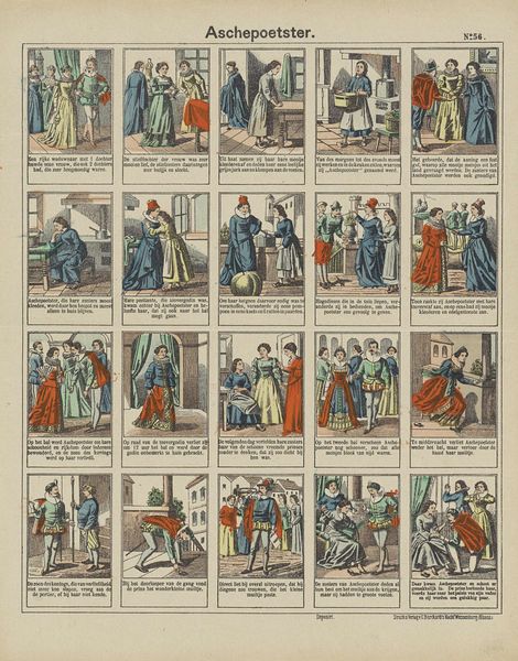 This illustrated print titled "De drie dwergen" or "The Three Dwarfs," was created by Charles Burckhardt's successors. It presents a comic strip-like narrative. The story unfolds in a series of panels and depicts a woman and a man who are unable to have children, making a deal with three dwarfs to grant them a child if she gives the dwarfs her first born. Gender roles are central; the woman’s role is domestic, emphasizing her duty to procreate. The dwarfs, as supernatural beings, complicate the social order. While seemingly a tale of fantasy, the story reflects societal pressures around childbirth and the perceived roles of women and men in the family structure. The print is not just an illustration of a fairy tale but an encapsulation of cultural expectations. It invites us to consider how these narratives, deeply embedded in folklore, shape our understanding of gender, family, and societal obligations, all while weaving a fantastical tale.