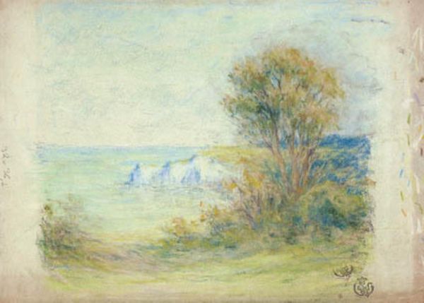 Curator: Alright, let's take a look at Claude Emile Schuffenecker's "Kystlandskab ved Etretat (?)," dating from between 1889 and 1892, held here at the SMK. Editor: Ah, this pulls me right in with its atmosphere. A coastal scene awash in a dreamy, almost melancholic haze. The colours feel muted, like looking through a soft lens. Curator: Precisely. Schuffenecker, a post-impressionist, captures this vista using pastel and coloured pencil. Notice the use of line and the 'en plein air' technique suggesting an intimacy with the landscape and weather patterns. The open air becomes almost palpable. Editor: I'm particularly drawn to the lone tree on the left. The wind seems to be tugging at it, the pastel strokes mirroring that sense of movement. The cliffs in the background appear veiled, softened by the mist. I can almost feel the dampness in the air, mixed with some unidentifiable earthy scent. Curator: Absolutely. Schuffenecker, though less known than his contemporaries like Gauguin, certainly shared their fascination with emotional expression through colour. This composition subtly hints at something just beyond reach—a feeling, perhaps, or a memory. What do you suppose the question mark is doing behind "Kystlandskab ved Etretat?" It’s almost cheeky. Editor: Perhaps Schuffenecker was hinting at the ambiguity of perception itself—the difficulty of definitively capturing a landscape's true essence, even when observed directly. It could also suggest that maybe that place is near Etretat. That's a loaded area considering Impressionism and landscape paintings in general. Or maybe that landscape is somehwere else entirely, an amalgamation that resides purely within the artist's imagination. Curator: Fascinating how a work on paper can stir such contemplative thoughts. Schuffenecker creates more than just a scene; it’s an emotive experience in layered tones, questioning not just what we see, but how we see it. Editor: For me, this piece whispers secrets, an ode to fleeting moments that stay with you, their edges softened by time and memory. Thanks for making me revisit such places, curator.