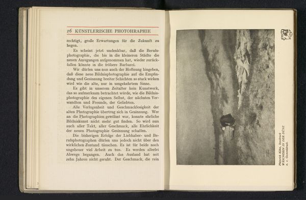 Editor: So, here's "Fotoreproductie van een foto door Robert Demachy, voorstellend een vrouw aan de kust in Bretagne"—or, a photoreproduction of a photo by Robert Demachy, showing a woman on the coast of Brittany, from before 1907. The image has a haunting quality. What strikes me is its depiction within what appears to be a larger book. How does understanding the historical and cultural contexts shape how we view this image? Curator: It’s key to consider this within the burgeoning visual culture of the late 19th and early 20th centuries. Photography was still finding its place amidst established art forms like painting and sculpture. Consider that the very text beside it describes artists becoming disinterested with photography as it turned into a scientific endeavor. The inclusion of Demachy's image within a publication positions photography as a tool for knowledge dissemination, influencing how it was perceived by the public and other artists. Editor: That’s fascinating. So, by being published, it gains a different kind of validation? Curator: Precisely. The book format suggests a specific mode of engagement – quieter, more contemplative, maybe even more "respectable" than, say, a postcard. And how do you think the landscape – the specific depiction of Brittany – might contribute to its historical importance? Editor: I guess it hints at an interest in capturing authentic or "unspoiled" scenes. Maybe even an idealized vision of rural life? Curator: Exactly! This yearning for an idyllic past becomes prevalent, partly fueled by rapid industrialization. The "Fotoreproductie" becomes a mediated experience of that, circulated through print and reinforcing a particular cultural narrative. Editor: I never thought about the implications of the publishing format like that! It gives so much more insight. Curator: Absolutely! Context can reveal that an image never speaks for itself; its meaning is always shaped by the institutions and practices that surround it. Editor: This discussion made me rethink how I approach historical photography; seeing it within its specific cultural moment brings it to life!