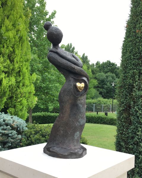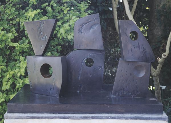 Curator: This monumental piece by Dame Barbara Hepworth is entitled "Two Forms (Divided Circle)". It stands here in the artist’s sculpture garden. Editor: The division is immediately striking— the rough bronze surfaces contrasting with the smooth, hollowed interiors of each form. Curator: Hepworth was deeply influenced by the postwar social consciousness, using abstract form to explore themes of human connection and separation. Editor: The sculpture’s scale demands a physical response from the viewer. The negative space carved out by Hepworth becomes just as important as the material itself. Curator: Indeed. Placed in her garden, it blurs the lines between organic and man-made, reflecting the era's focus on nature's healing power. Editor: Ultimately, its power lies in its ambiguity. A beautiful study of form, space, and the delicate balance between opposing forces.