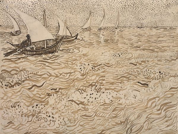 Curator: Alfred Wallis’s “The Blue Ship” at the Tate collection presents a fascinating example of naive art from a Cornish mariner turned painter. Editor: It strikes me as a memory painting, all bold colors and flattened space, almost dreamlike in its simplicity. Curator: Wallis began painting late in life, depicting maritime scenes from memory. His work gained recognition through artists like Ben Nicholson and Christopher Wood, who discovered him in St. Ives. Editor: The ship looms large, doesn't it? Almost a symbol of survival amidst the turbulent sea. And those lighthouses, they act like beacons of hope, perhaps guiding not only the ship but also Wallis's own memories. Curator: Indeed. Wallis's artistic vision was profoundly shaped by his life at sea and his experience of a rapidly changing world. His art stands outside academic conventions, offering a raw and intensely personal reflection of the sea. Editor: It's like a map of the mind. It offers an authentic expression, even if the perspective and proportion are non-traditional. A really lovely painting that resonates deeply.