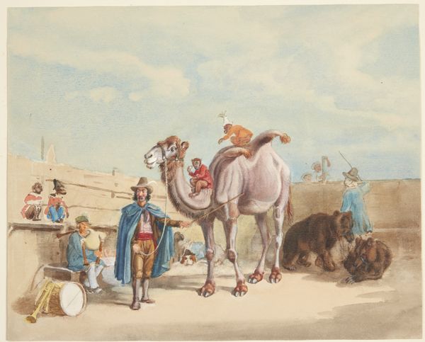 This drawing, whose date is unknown, by Willem Romeyn, presents a muted palette of sepia washes that construct a pastoral scene dominated by a large, ornamented mule. The composition draws us into the everyday lives of these figures and animals. Romeyn’s adept use of line and wash creates a sense of depth, with the distant city rendered in lighter tones compared to the darker, more detailed foreground figures. The arrangement of the figures and animals isn't random. Their placement suggests a moment of pause, inviting us to consider the dynamics between humans and animals, labor, and the environment. The formal elements here speak to broader cultural codes, reflecting on the relationship between man and nature. The drawing is not just a depiction of a scene, but an exploration of social and economic structures as seen through the lens of the Dutch Golden Age. The muted tones and careful composition invite contemplation on the interplay between form and meaning.