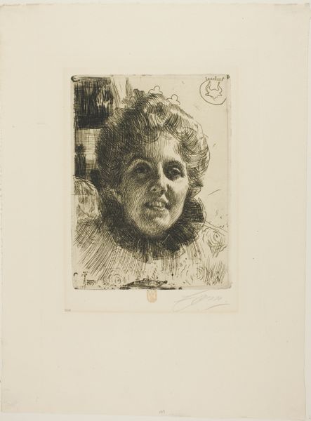 Editor: Here we have Anders Zorn’s “Aurore (Mrs. Aurore Klintberg, née Oxenstierna, Head),” an etching from 1909. I’m immediately struck by the delicate yet precise use of line. What can you tell me about this portrait, thinking about the artist’s approach? Curator: Zorn was celebrated for his ability to capture light and texture using etching techniques. It's important to consider that etching, as a printmaking medium, democratized image production to a degree. Here, look at the sheer volume of fine lines and the almost scribbled effect in the darker areas, building volume with simple labor. Can you see how that approach challenges traditional painting norms and its association with aristocratic patronage? Editor: Yes, the hatching creates a sort of restless energy, different from a smoother painting. But how does this tie into the social context of the subject? Curator: Notice that he depicted Mrs. Klintberg using a medium rooted in the process of repetitive mark-making and transfer. While portraits have often served as status symbols, here the means of production -- the labor involved, the accessible nature of printmaking -- bring an interesting twist to our perception of societal elite. The materiality subtly reframes her representation. Editor: So you're suggesting that the etching process itself brings a critical element, disrupting class distinctions through its own means of production. Curator: Precisely. Consider that Zorn often depicted scenes of everyday life and working-class people as well; here, it isn’t just about *who* is represented, but *how* she’s rendered via this accessible print medium. How might the consumption of art change if it's easier to circulate in society? Editor: I see your point. Thinking about this portrait in terms of its materials and its social implications gives me a completely new way of appreciating it. Thanks! Curator: And recognizing the materials helps us reassess its meaning within the broader context of art production and society.