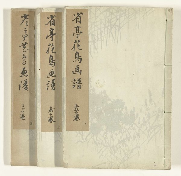 These are three pattern books or "Narumi Stofpatronen" by Odagiri Shunko, held at the Rijksmuseum. The books are defined by their soft, muted tones and a minimalist yet deliberate arrangement of text and image. The covers employ a restrained palette. A light beige field, reminiscent of aged paper, serves as a backdrop for dark grey, stylized birds. These are sparsely scattered, creating a visual rhythm that is both subtle and engaging. Each book’s spine is marked with vertical columns of Japanese characters, lending a structural elegance. These columns are meticulously aligned and seemingly ordered. The texture of the covers is tactile. This gives the artwork a sense of depth and history. Ultimately, it is this careful balance between the planned and the incidental, the textual and the visual, that defines the aesthetic of the books, inviting continuous inspection.