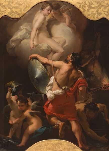 Charles-Joseph Natoire created "Jupiter and Callisto" using oil on canvas. The artwork is a symphony of soft hues and curvilinear forms, evoking a sense of mythological romance. The figures are entwined in a composition dominated by rounded shapes, from the billowing clouds to the characters' limbs, all set within an oval frame. Natoire employs color to distinguish the earthly from the divine, setting the pale flesh tones against a backdrop of celestial blues and reds. The artist organizes the artwork around a central diagonal axis where Jupiter embraces Callisto, a nymph. Her slightly raised hand is the fulcrum that directs the viewer's eye, disrupting a purely sensual reading. Natoire utilizes visual language to create an emotional narrative. The painting, with its fluid lines and balanced color palette, invites contemplation of the shifting boundaries between desire and divinity, form and meaning.