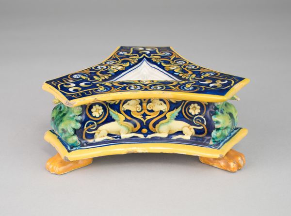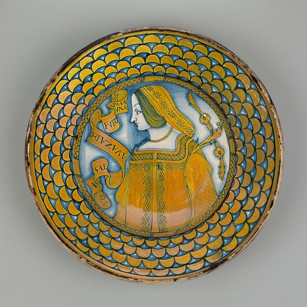 Editor: This ceramic bowl, "Bowl with a Bust of Mucius Scaevola," made by Faenza Potteries around 1535-1545, really strikes me. The contrasting patterns and colors are captivating, but I’m not sure how to interpret the imagery. What stands out to you in terms of its design? Curator: What is immediately evident is the dynamism between the central portrait medallion and the surrounding ornamentation. Notice how the portrait, confined within geometric rigor, is softened by the fluid scrollwork cascading around it. Observe the careful chromatic balance. Editor: I do see that tension between the rigid center and the swirling decoration, almost fighting for dominance. What does that interplay suggest to you? Curator: Precisely. The very application of historical imagery upon functional ware begs consideration. Ask yourself, is this utilitarian object elevating its user or domesticating heroism to the level of daily use? Is it simultaneously honoring and containing Scaevola? How might such compression serve the owner? Editor: That's a great point. So the structure itself holds a kind of tension. I hadn’t thought about it like that, as a way of taming heroism through design. I’ll definitely look at similar pieces differently now. Curator: Indeed. The formal elements in art are seldom merely decorative; they actively shape meaning and experience.