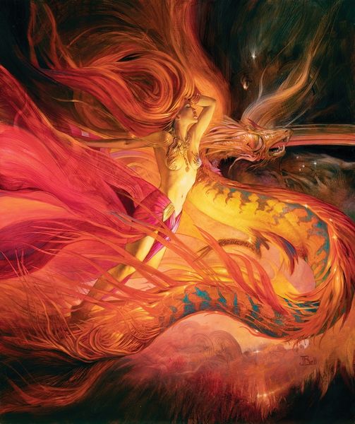 Curator: A Moment In Paradise. It's an intriguing work of art, quite the fantastical scene. What springs to mind for you? Editor: First thought? Tactile. The paint handling, especially the feathery plumes around the creature, looks almost three-dimensional, like meticulously crafted fabric. I wonder about Bell's studio practice. Curator: It does evoke a specific atmosphere. Notice how the figure hesitates at the edge of this vibrant… abyss, maybe? It’s reminiscent of the classical trope of temptation, of confronting the unknown depths within ourselves. Perhaps this is Bell playing with those timeless symbols. Editor: It's certainly playing *something*. This creature’s head alone, with its tentacles and reptilian skin, is a showcase of surface. It feels like a high-skill application of paint textures as visual strategy, very knowing about the historical precedents of fantasy illustration while embracing its contemporary materiality. Is it acrylic paint I wonder? Curator: The erotic overtones of this scene are also inescapable. Consider how myths and fairy tales use the forbidden, or even monstrous, to represent desire. In the context of art history, it carries significant psychological weight to visualize taboo attractions. Editor: I'm curious about the market these kinds of images feed. I assume that Bell meticulously crafts them in pursuit of that highly polished sheen. Also, why is her back turned? She almost seems reluctant to connect to us… the painting looks to generate longing by creating visual tensions around inaccessibility. Curator: A longing fueled perhaps by primal archetypes of woman and beast! From Lilith to siren legends, these combinations often symbolize a potent blend of allure and danger. Do you think that's her power? Editor: I wouldn't say "power," so much as skill. Think of the commercial framing and conditions of labor for producing the painting... the layers upon layers of deliberate construction… but there is a undeniable pleasure and even excitement derived from her handling of pigments and forms. Curator: It’s true—Julie Bell builds that tension with colors, creating a visual paradox between beauty and peril. Thanks, for this view on this “tactile" exploration, a look into those historical-material processes, from its physical components to possible motivations. Editor: And you for showing this, it really opens the doors, making connections between this canvas to traditions of fantasy craft, as it negotiates those eternal forces.