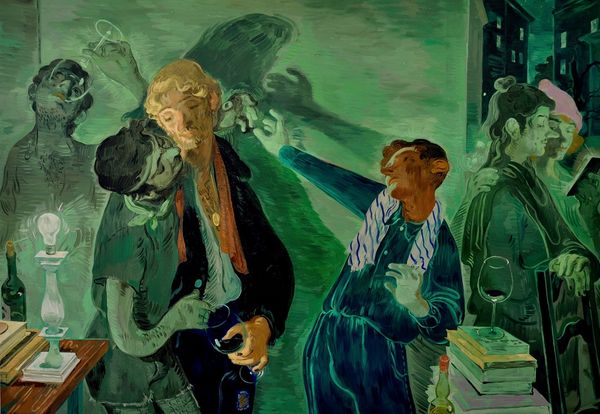 Curator: This intriguing artwork by Iwo Zaniewski, created in 2021, is titled "Prof. Krzysztof Meissner and Sir Roger Penrose working on Conformal Cyclic Cosmology." What are your initial impressions? Editor: Well, visually, it's quite busy! The layering of color gives a slightly restless feel, but there's also something very grounded about the domestic setting. The light feels warm. Curator: Yes, Zaniewski creates a sense of intimacy within the space. I am drawn to the numerous symbolic details dispersed around the painting: recurring geometric shapes, scattered papers on the floor, what appear to be esoteric cosmological drawings... it almost resembles a carefully curated dreamscape. Editor: The presence of the chalkboard and the stacks of books definitely evokes a learned atmosphere, almost that of a classic 'intellectuals at work' depiction, and the two men represented cement that theme. I wonder, though, about accessibility: Does it succeed in broadening science appreciation to the public? Curator: I think the accessible elements include familiar symbolic representations – we understand stars, papers as signs of study and work, equations on a blackboard. Together, they create a powerful symbolic representation of intellectual labour that resonates, regardless of whether you fully grasp Conformal Cyclic Cosmology. Zaniewski translates esoteric science into symbols we instinctively respond to, fostering intellectual curiosity in everyone, not just the expert. Editor: Interesting. The symbolism does pique my interest. What truly catches my eye are the political elements - or perhaps, the lack thereof. Given the complex socio-political climate surrounding scientific research and its funding in 2021, isn’t it noteworthy that such topics remain unaddressed? Curator: I'd suggest it's not an intentional omission. I think the artist focuses on an internal, cerebral, even timeless realm, abstracting them from particular debates. Editor: Perhaps, perhaps not. Nevertheless, Zaniewski’s decision sparks discussions on science's positioning within today's society. Curator: I think that regardless of one's perspective on it, Zaniewski prompts consideration of what remains fundamental. Editor: Well, thank you for helping me to contextualize those ideas. It definitely enriches one's encounter with this symbolic portrayal.