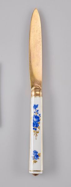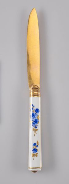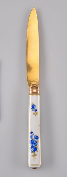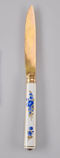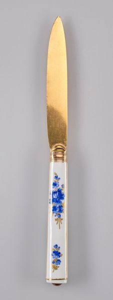 Editor: Here we have an 18th-century ceramic knife from the Meissen Porcelain Factory. Its handle is adorned with decorative, baroque-style blue florals. The knife's dainty size strikes me; it seems more like a decorative piece than a functional tool. How would you interpret this work through a formalist lens? Curator: I see a deliberate juxtaposition of textures and materials. The smoothness of the ceramic handle provides a striking contrast against the gleam of the golden blade. Consider also the tension between the organic, flowing floral patterns and the rigid geometric form of the handle itself. How does this tension influence the overall composition? Editor: I think it makes the florals pop even more, but the clean handle prevents the floral pattern from appearing too whimsical, keeping the design sharp. Curator: Precisely. Now, observe the palette: the limited range of blue and gold, set against the stark white background. These hues and their interplay structure the overall visual experience and allow you to decode symbolic weight or even emotional tension in what might otherwise seem merely decorative. Where might such chromatic constraint lead us? Editor: Perhaps it suggests a certain restraint, befitting the manners of the period, or that a higher value was placed on aesthetic cohesion than expressive range? Curator: An astute observation. The color choices certainly communicate social and artistic values. The knife's form invites consideration of the symbolic meaning embedded within this domestic object. What have you learned from deconstructing this artefact? Editor: I have a newfound appreciation for the way the shape and style add to its meaning. Viewing decorative pieces as more than pretty objects changes everything! Curator: Indeed, by examining how form mediates material, and the dialogue between texture, shape and design, we gain insights into the social, historical and cultural fabric from which the artefact originates.