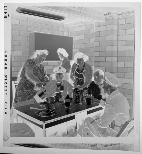 Editor: This untitled photograph by Jack Gould captures three men checking in at an airline counter. The negative contrast gives it an eerie feel. What strikes you about this image? Curator: It reflects a particular moment in the history of air travel, doesn't it? Note the attire, the counter design, the very notion of personal interaction at check-in. How does this compare to the contemporary airport experience and what underlying social and cultural shifts does this image reveal? Editor: I hadn't considered that aspect. It's a stark contrast to today’s self-service kiosks and the streamlining of travel. Curator: Precisely! This image offers a glimpse into the ritual of travel, highlighting the socio-economic factors that defined who had access to it. What does it say about the public perception of air travel at the time? Editor: It's definitely a window into a different world. Thanks for pointing that out!