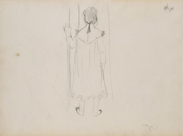 Editor: We're looking at "Girl with Apron and Cap, Seen From the Back" by Bramine Hubrecht, made sometime between 1865 and 1913. It’s a pencil drawing on paper. It feels...unfinished, almost fleeting. Like a memory fading at the edges. What strikes you about it? Curator: It does, doesn't it? Like catching a glimpse of someone's inner world. What interests me most is the back view. We're denied the easy access of a face. Makes you wonder, doesn't it, what she's thinking, what she's looking at. The anonymity adds a layer of intrigue, wouldn't you agree? Like a stage, waiting for a play. Editor: Absolutely. I hadn’t thought about it that way. So much portraiture focuses on the face as the primary storyteller. Is she supposed to represent someone in particular or is it just the subject what matters? Curator: Well, that’s the fun part. I think with an unassuming sketch like this, there's an intimacy that maybe a finished piece would lack. Hubrecht invites us to create our own stories, to breathe life into her brief sketch, perhaps reminding us that it's not what we show but what we keep to ourselves that truly defines us. It’s more of a vibe than a definitive statement, do you know what I mean? Editor: I think so. It feels less about perfect representation and more about capturing a feeling, maybe even the feeling of simply observing someone else. Curator: Exactly! And I'm sure Hubrecht would enjoy our personal take on her figure, too. Art thrives on this back-and-forth of perception. Editor: It’s like the sketch has given me permission to invent my own ending. Thank you for that thought! Curator: Anytime. Art is never truly finished; we all add to it.