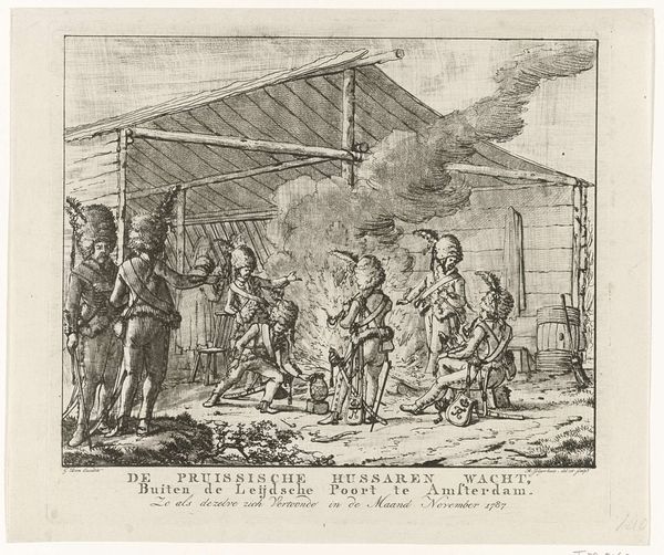 Editor: Here we have M. Schaep's etching from 1649, titled "Islamitische galeislaven op het strand," or "Islamic Galley Slaves on the Beach". There's such stark contrast in the way the figures are rendered, and that massive plume of smoke dominates the scene. What do you see in this piece, especially considering its historical context? Curator: What immediately strikes me is the depiction of power dynamics. Consider the title – it’s presenting a specific viewpoint. We must critically analyze how the artist is choosing to represent these individuals, labeled as "Islamic galley slaves." Are they being depicted as victims, or is there something else at play? Editor: It's definitely uncomfortable to think about the gaze involved here. The figures on the left, who I assume are the overseers, seem so detached. Curator: Precisely. The etching needs to be contextualized within the history of Dutch maritime power, trade, and unfortunately, also enslavement. The scene is rendered with enough detail to suggest witnessing, almost inviting a sense of participation through observation. How does this image position the viewer? Is it asking us to empathize, or is it reinforcing a hierarchy? Editor: I didn't consider that aspect before. I was mainly focusing on the composition and the sort of narrative elements. Curator: Exactly, and that is a key move of Baroque art: drama! This image presents more questions than answers, doesn't it? Consider also that even representations of historical events, especially those involving marginalized groups, are rarely neutral. They carry within them the ideologies of the time. Editor: It makes me think about who was commissioning these images and for what purpose. It changes the way I see the artwork itself. Thank you! Curator: And that shift in perspective is exactly the point. It's about engaging with art, with history, and with the complexities of power.