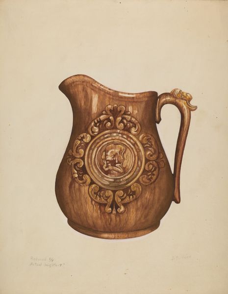 Curator: Oh, I adore the earthy feel to this. It’s titled "Crockery Pitcher," an artwork crafted around 1938, as far as we know. Ernest A. Towers Jr. used watercolor and drawing to capture it. A striking image of everyday life! Editor: My first thought is fairytale. Or perhaps a well-loved, passed-down object in a children’s story? It has that kind of warm, reassuring, yet slightly fantastical air about it. The deep browns and golden highlights are lovely, but the illustrations bring in so many narratives. Curator: Indeed. And if we peer into these "narratives," we find ourselves navigating a mini-encyclopedia of symbols. Notice the animals. The hare leaping conveys fertility, renewal, almost reckless energy, stark against the dormant fox that makes up the handle. It’s that beautiful play of opposites. Editor: That handle *is* something! So whimsical! Almost like the fox is overseeing whatever might be poured out from the pitcher, making sure no shenanigans occur. As a whole piece, there’s something almost alchemic, you know? Blending the domestic with mythic, ordinary vessels turning into containers of potent story. Curator: Absolutely. The artist is consciously drawing from a very deep well of shared mythologies. He brings forth what was familiar and transforms it, embedding archetypes into something one might drink water from! Isn't it compelling how common forms carry a powerful psychological weight? A rabbit on the side isn't just decoration, it has layers! Editor: Exactly. Makes one consider the other, perhaps invisible stories that our everyday objects whisper to us. Everything's loaded, right? From the specific tilt of that handle to the specific menagerie it houses, this illustration sings. Curator: I believe that’s why it is such an enduring work. The beauty resides in the layers. This illustration reveals how deeply intertwined we are with both nature and symbolism— it’s all reflected back. Editor: Right? Well, now I might start seeing ancient archetypes in my coffee mug. All I know is next time I’m pouring some tea, I’ll look a little bit closer.
