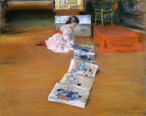 Editor: William Merritt Chase's "Child with Prints," from 1884... It's a flurry of pastels and charcoal, but I find the child’s serious expression strangely compelling amidst the chaos. How do you see this work? Curator: It's fascinating how Chase captures this seemingly private moment of childhood engagement, but within a highly constructed, even performative space. Note the artistic mess – is it genuine, or is Chase presenting us with a deliberately "artistic" vision of childhood within an art-filled environment? Consider also, whose child is this and what access did they have? How is Chase constructing childhood in relation to access and artistic labor? Editor: That's interesting – almost as if the prints themselves are props, turning the child into a symbol of artistic appreciation? Curator: Exactly. This ties into the rise of art collecting and a growing art market during the late 19th century. Child becomes intertwined with art in ways that signal wealth, taste and privilege. Chase presents us with an image that is both intimate and highly aware of its own display. Editor: So, it's not just a portrait; it's also a statement about the cultural value of art and how children were seen in relation to that value at the time? Curator: Precisely. The art is about shaping the child as a symbol, demonstrating how visual culture became crucial to defining and projecting social status. Do you find anything subversive about this work? Editor: Subversive? Not exactly. But seeing how strategically everything is arranged gives me a different perspective on the seemingly candid nature of impressionist portraits. It all feels staged. Curator: Agreed. And by recognizing that staged quality, we can begin to understand the complex ways that art reflects and reinforces social and cultural values. Editor: That's a helpful analysis! Thanks, I'll look at art, particularly portraits of children, very differently now.