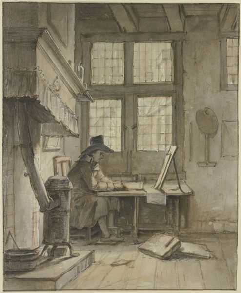 Jacobus Ludovicus Cornet rendered this ink drawing, "Portret van Gerrit Lamberts, zittend in een leunstoel in het Prentenkabinet," using delicate lines and washes to capture the sitter within his environment. The composition is structured around a play of light and shadow, which articulates the room's geometry and imbues it with a contemplative mood. Note how Cornet uses linear perspective to define the space, guiding our eye from the foreground to the window at the back. The subject, Gerrit Lamberts, is positioned centrally, his figure framed by the chair and table, suggesting a sense of order and intellect. Yet, the drawing's overall effect goes beyond mere representation. It speaks to a broader concern with the relationship between space, identity, and representation. Cornet destabilizes a clear, fixed meaning through his use of transparency and depth. The drawing invites ongoing interpretation. This visual arrangement challenges viewers to consider how meaning is constructed through the interplay of formal elements and conceptual frameworks.