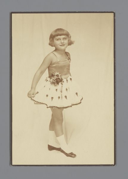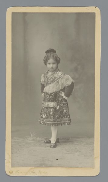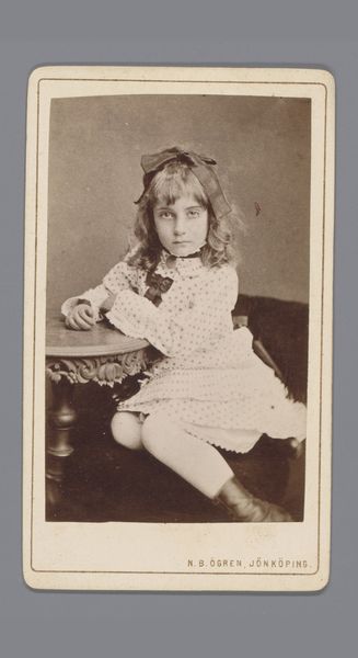 Curator: This is a portrait of an unknown girl posed by a chair. It was taken sometime between 1864 and 1877 by A. Delamare and A. Raguet. Editor: It's undeniably pretty, in that vintage, faded way. The muted colors lend a delicate feel, and the subject's gaze is surprisingly direct. It has that aged aesthetic with a pale colour palette. Curator: Let's examine the photographic process and its socio-economic context. In this era, portraiture became more accessible thanks to advancements in photography. The sitter’s social standing is obvious in her attire: lace detailing and the delicate chair represent middle-class aspirations, but were these clothes and props studio owned? It suggests the construction of social persona via manufactured image, sold and bought like a product. Editor: Yes, and how those aspirations are visualized is vital here. Note the balanced composition, with the girl gently angled against the ornate chair, her pale dress contrasting ever so subtly against the backdrop. There's an understanding of light and shadow at play, albeit constrained by the technologies available at the time. Curator: And it’s crucial to remember those constraints! Photographers like Delamare & Raguet weren’t just artists; they were small business owners catering to the needs of the aspiring middle classes and employing techniques to cut costs in time and materials while constructing those idealized images for consumers of image. The surface of the paper has signs of age, showing not just light deterioration but material deterioration inherent in photography over time. Editor: The girl's posture, resting against the chair, strikes a poignant note too. A structural reading of the framing accentuates a moment of quiet repose – almost staged as an idealized iconographic depiction of childhood, frozen for prosperity, to be later distributed as a token of familial connection and passed between loved ones and friends.. Curator: Right, that distribution also involved specific production techniques - printing, mounting, delivering in bespoke card or framed within a paper passepartout. These all played a role in producing this moment of personal branding. Editor: Absolutely. It's a delicate dance between social statement and a constructed reality. It is beautiful from both aspects. Curator: Considering all these different levels, this piece truly captures a moment of historical and economic change through one small manufactured picture. Editor: Indeed. It provokes questions about representation, labor, and class through such simplicity of means.