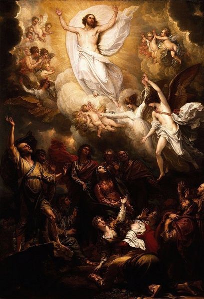 Editor: Luca Giordano’s "Resurrection," painted around 1665 using oil paint, definitely has this otherworldly quality. The contrast between the radiant figure rising and the darkness below is striking. What do you see in this piece, especially thinking about its creation? Curator: It's crucial to consider the social context. Giordano worked in a Naples dominated by Spanish rule and the Counter-Reformation. This image wasn't just divinely inspired; it was materially produced through specific labor conditions and intended for a particular market – the church, likely. What do you notice about how the paint itself is applied? Editor: There are dramatic areas of light and shadow. You can really see how Giordano used that technique. I mean it almost feels like I can feel the texture in person, or how fluid the paint was at times. Curator: Precisely. The fluid brushwork wasn’t just aesthetic. It was about efficiency, a way to produce emotionally resonant images quickly to meet demand. These artists were effectively running workshops, responding to economic pressures as much as spiritual ones. Consider the pigment itself – where did those colors come from, and who mined or manufactured them? How did they come to define divinity? Editor: So, you’re saying the very materials speak to the broader world at the time? Curator: Absolutely! Even the canvas preparation tells a story about craftsmanship and resources. By unpacking the making, we demystify the genius narrative and understand art as embedded in a web of social relations. Is that helpful? Editor: Definitely, seeing the social and economic forces at play, how the church needed art, and the artist’s production influenced even the way they applied the paint—it's fascinating. Curator: And it compels us to think about artistic value and artistic genius differently, it becomes more holistic, really. Editor: It definitely changes how I see "Resurrection," and painting overall! Thanks.