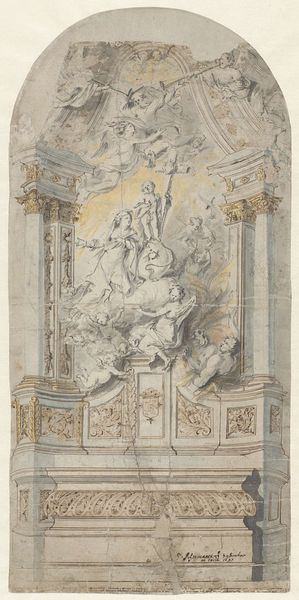 Editor: This is "Ontwerp voor een plafondschildering met allegorie op de Zeevaart," or "Design for a ceiling painting with allegory on seafaring," attributed to Elias van Nijmegen and created sometime between 1677 and 1755. It's a watercolor drawing, quite light and airy. What stands out to you in this design? Curator: The seafaring allegory is heavily laden with symbols of dominion and fortune. The figures aren't merely floating, they're almost presiding over an imagined seascape below. It's a demonstration of cultural power, evoking images of exploration and conquest through airy, idealized figures. The cherubs with their implements signal this mastery, don’t you think? Editor: I see what you mean. They seem to be celebrating that mastery, the cherub on the left has a little hammer. How do those Baroque-era symbolic motifs play out for us today? Curator: These motifs tap into a long lineage of visual representations. The clouds supporting the allegorical figures suggest an almost divine sanctioning of seafaring and trade. Think about how these images might resonate differently today, knowing the history of colonialism and exploitation associated with that era. The idealized figures hide a complex reality. Editor: So, while seemingly innocent, it carries a loaded historical weight? Curator: Precisely. It's a reminder that images always carry embedded meanings that change with time and context. Today, that initial impression of beauty is challenged by a deeper understanding of the realities represented. Editor: That's fascinating. It makes you think about how differently the original audience might have perceived this artwork versus how we perceive it now. Curator: Exactly. Visual symbols can become cultural mirrors reflecting both what was and what is.
