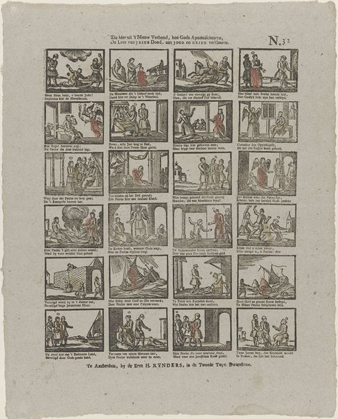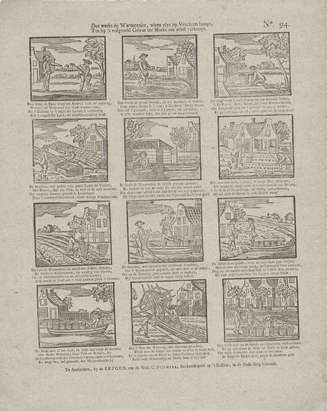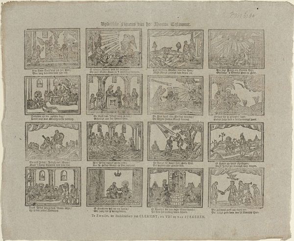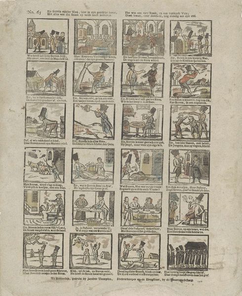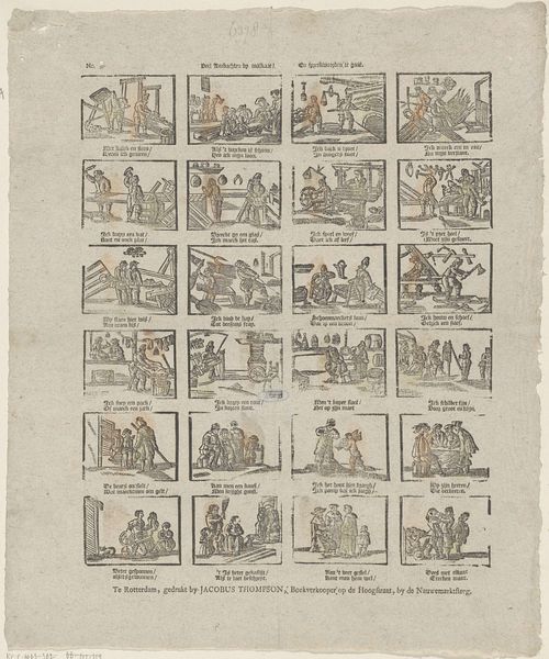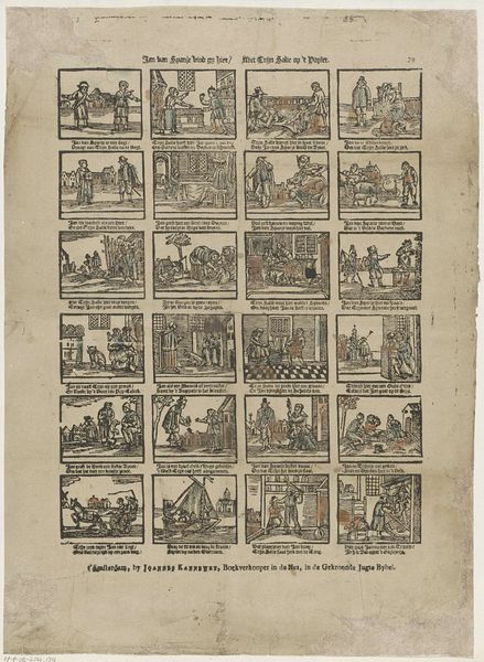 This broadside, whose title translates roughly to "Here lies Steven van der Klok, with all his great deeds," was printed by Jan Hendrik de Lange in Deventer. As a "work printer," de Lange likely made his living producing inexpensive printed matter for local consumption. The image is made from a woodcut, a relief printing process where the artist carves away the negative space around a design. This is a relatively quick and cheap way to reproduce images, well suited to ephemeral objects like this one. You can see the way the linear marks have been laboriously cut into the block, giving the images a graphic, vernacular feel. The scenes, arrayed like panels in a comic strip, recount the deeds of a man named Steven van der Klok. Each little vignette is printed from the same block, yet tells its own story. This is a form of early graphic storytelling, made possible by the industrialization of image-making. It is an interesting blend of craft production and proto-mass culture.