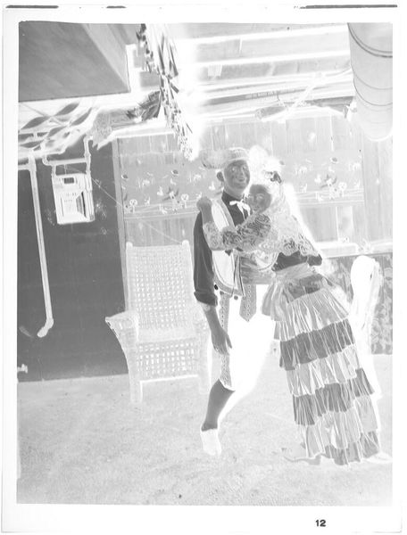 Editor: This is an untitled photograph by Jack Gould, showing a couple seated on chairs. The stark contrast and negative image give it a somewhat eerie feel. What strikes you about this work? Curator: I’m drawn to the chairs themselves, and the labor involved in their production. Were they mass-produced, or crafted individually? The social context of leisure, suggested by the couple, contrasts with the often-unseen labor behind these commonplace objects. What does their pose tell us about consumption? Editor: That's a perspective I hadn't considered. Thinking about the labor really changes my reading of the image. Curator: Indeed. The image invites us to look beyond the surface and consider the full material and social story.